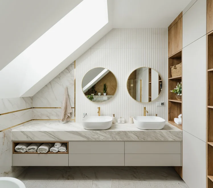 Łazienka stworzona do relaksu — subtelne beże, drewno i miękkie światło. Wszystko zaprojektowane z myślą o komforcie codzienności.